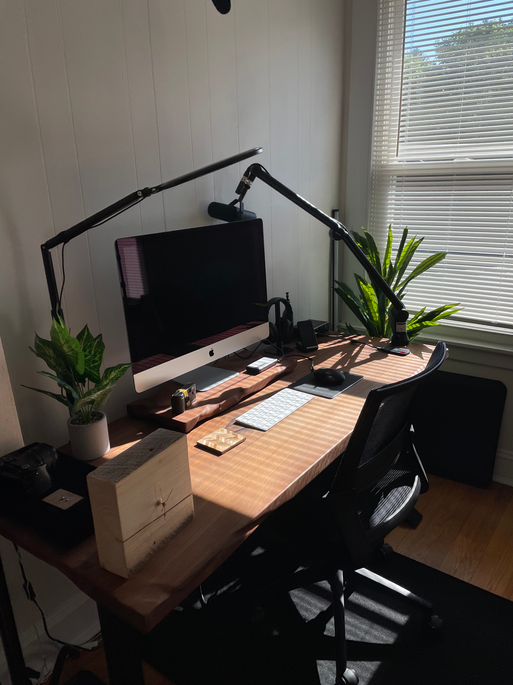 Because Owen works long hours in front of a screen, the science behind biophilic design played a critical role in shaping this piece. We focused on creating something that felt grounded and alive. The form is soft and organic with an all-natural hardwax oil allowing the depth of the grain to breathe. It feels like real wood because it is. Solid, and built to last, designed to support focus, flow, and creative longevity for the most ambitious creators.